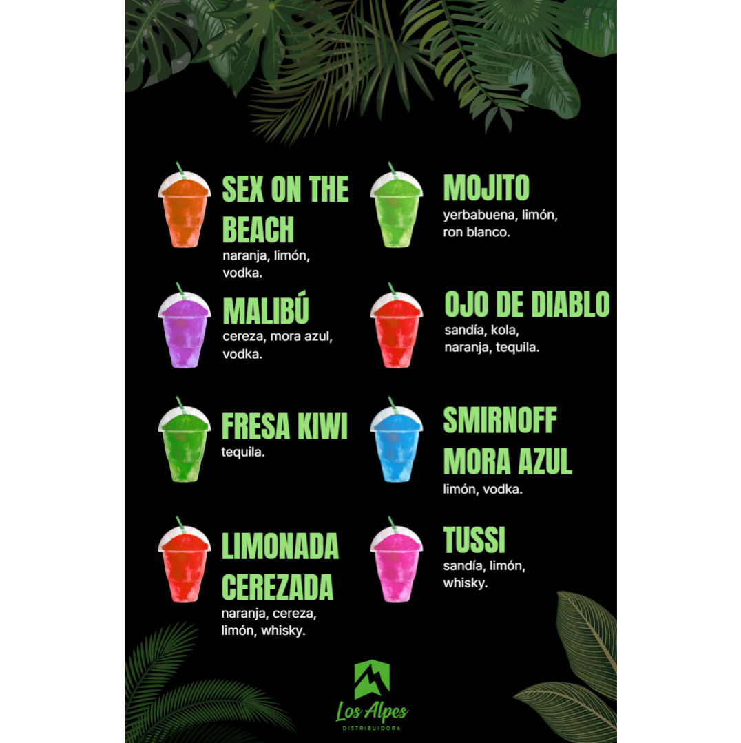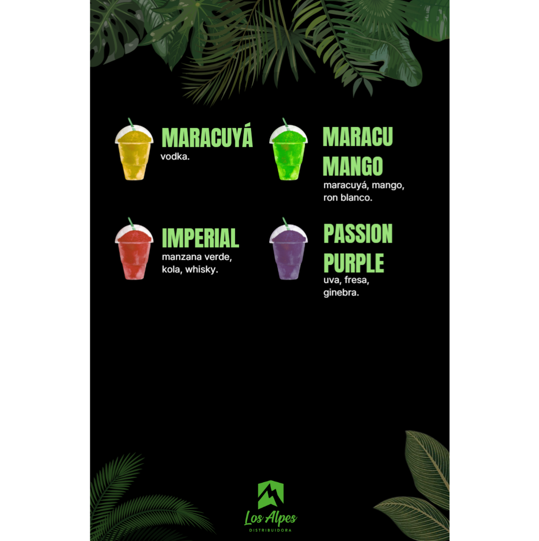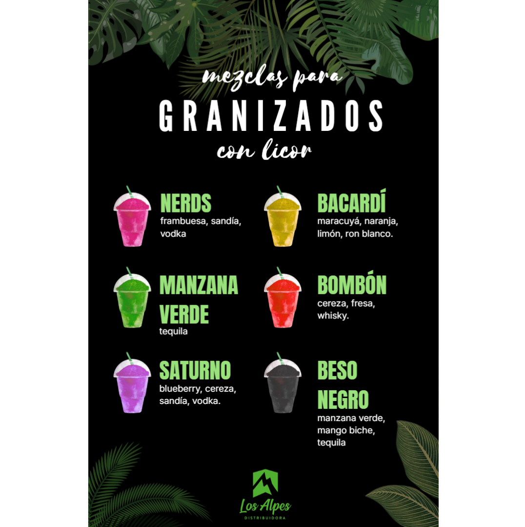 Mezcla líquida lista para preparar granizados con licor, elaborada con 12% de alcohol y un rendimiento de hasta 6 litros por envase. Ideal para bares, eventos y coctelería creativa.